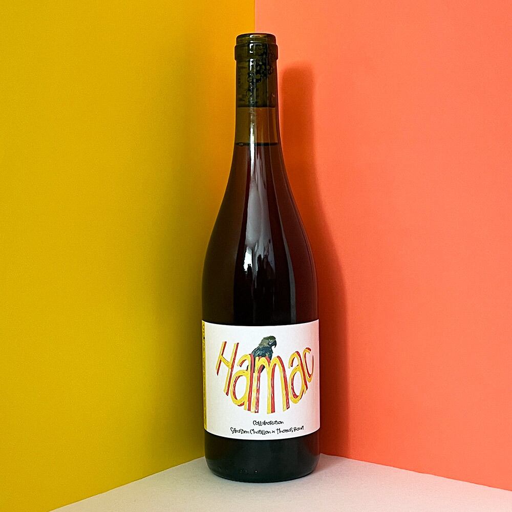 実は、同じコリアでヴァランタン・ヴァルがスフレール・スリエと「カノエ(フランス語でカヌー)」というコラボレーション・キュヴェを造っていたので、彼らに対するジョークの意味も含まれています。ラベルはトマ自身で作成しました。カリブ海を訪れた際に撮影したオウムの写真を南国風にアレンジし、ハンモックの形に「Hamac」の文字を描きました